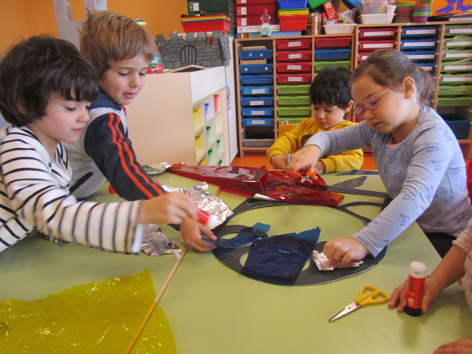 Yo pongo el pegamento y vosotros pegais el papel.